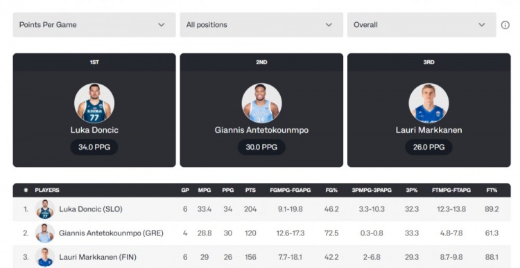 目前东契奇在本届欧锦赛出战6场比赛,场均轰下34分排名第一,字母哥出战4场比赛场均轰下30分排名第二,排名第三的是马尔卡宁(26分)。