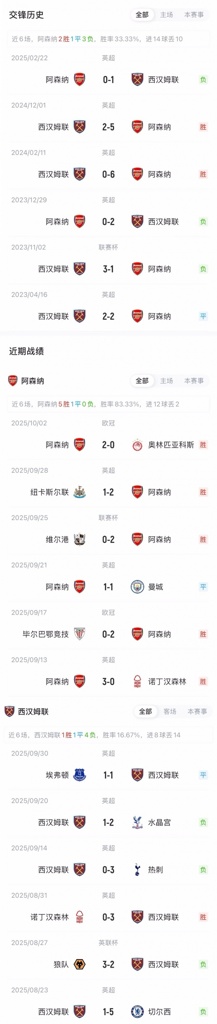 阿森纳前6轮4胜1平1负目前暂居英超第3;西汉姆联6轮仅1胜积4分深陷积分榜倒数第二。上赛季阿森纳曾客场5-2大胜西汉姆联,但回到主场0-1爆冷负于对手。