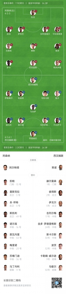 阿森纳首发:1-拉亚、12-廷伯、2-萨利巴、6-加布里埃尔、33-卡拉菲奥里、10-埃泽、41-赖斯、8-厄德高、19-特罗萨德、7-萨卡、14-约克雷斯