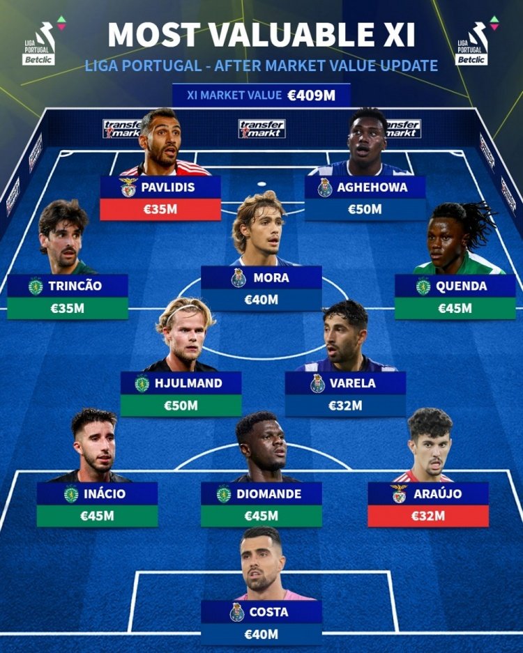 10月1日讯 德转日前更新葡超联赛身价,并列出葡超最贵阵容,葡萄牙体育5人入选。