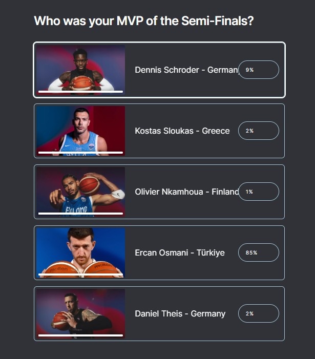 9月13日讯 男篮欧锦赛半决赛已落下帷幕,欧锦赛官方发起了半决赛MVP投票,截至目前,土耳其男篮球员奥斯马尼以85%的票数断档领先。