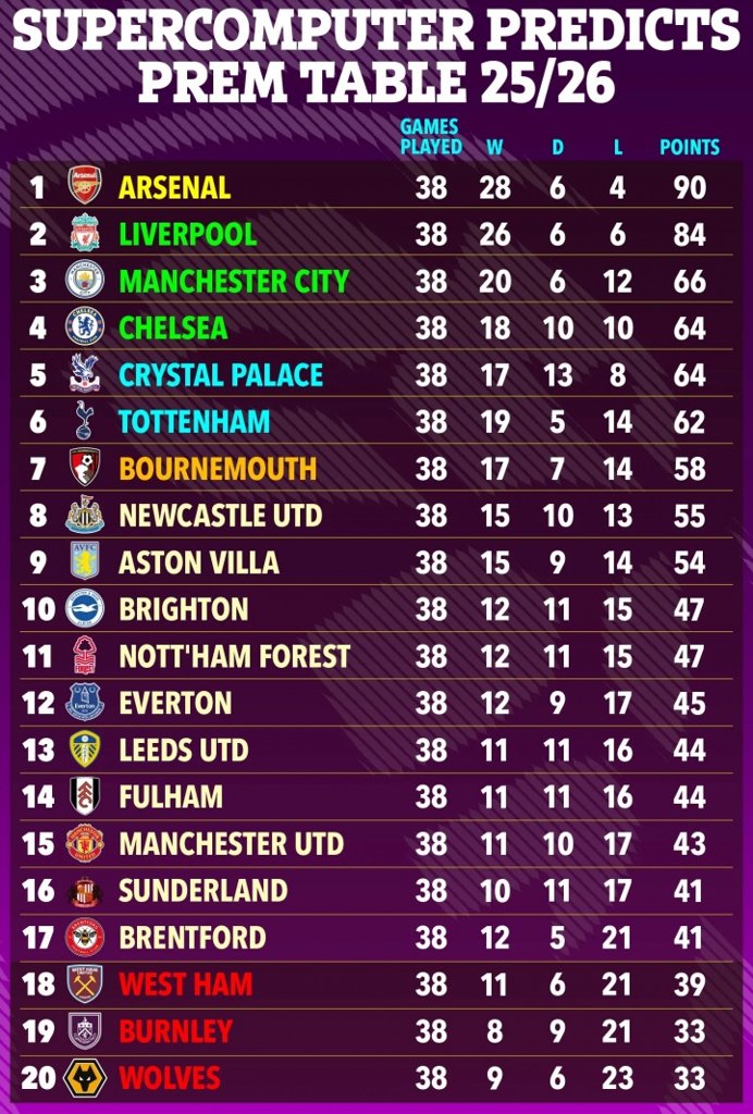 09月29日讯 英超第6轮战罢,超级计算机根据各支球队的积分和表现情况,以及球队的阵容,预测了本赛季英超的最终排名。阿森纳将以90分夺得英超冠军,利物浦84分第二,曼城、切尔西进入前四,曼联仅排名英超第15。