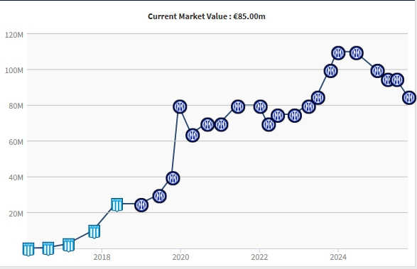 “他仍是联赛中最稳定的前锋之一,但市场动态和风格偏好的转变,降低了他未来维持最高市值的可能性。”