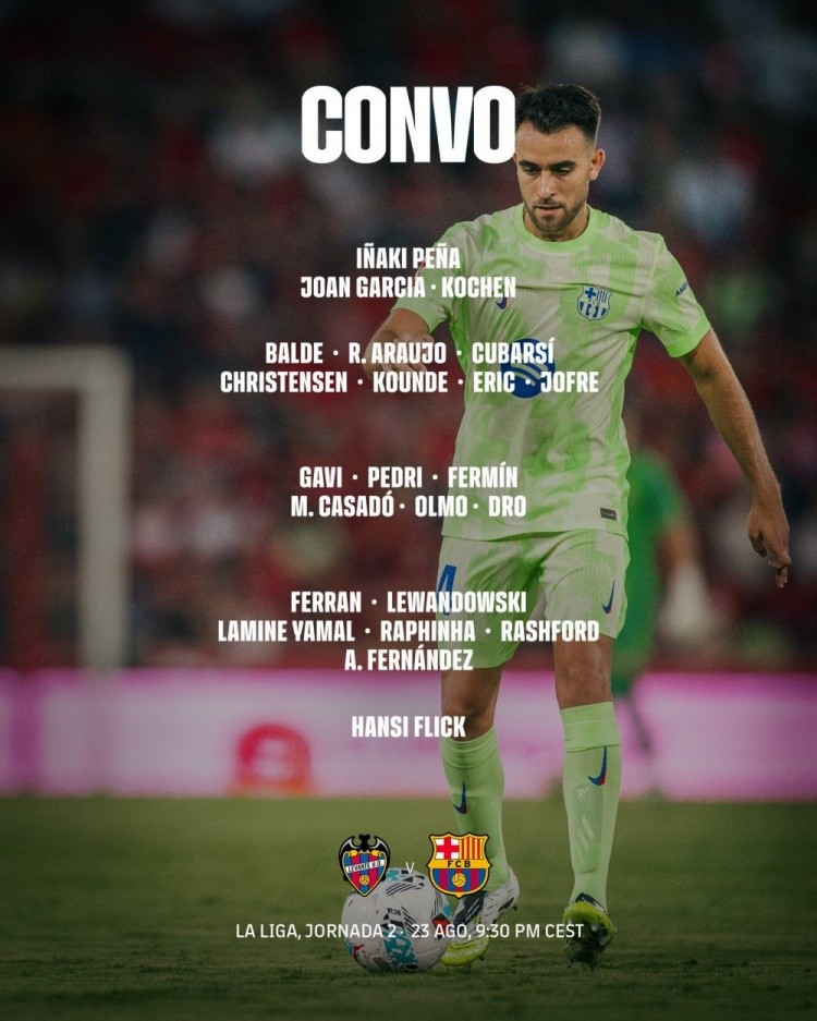 8月23日讯 北京时间明天凌晨3点30分,巴萨将在西甲第二轮比赛中客场对阵莱万特。巴萨公布了此役的球员名单,什琴斯尼因未注册缺席,德容也不在名单之中,莱万回归名单。